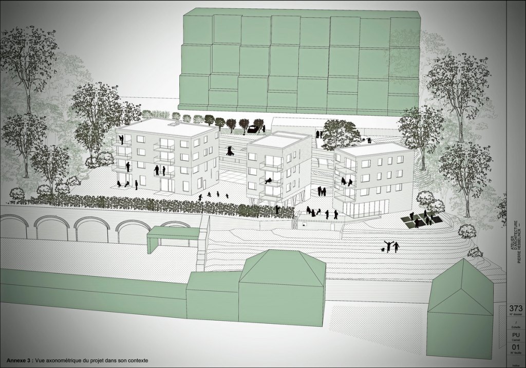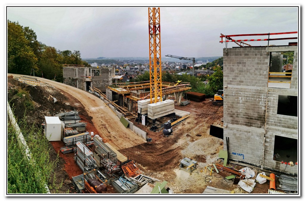 Le site est un grand terrain de + /- 4.500 m², exposé SE, avec vue imprenable sur la Ville et sur lequel nous sommes en train de construire 14 logements de tailles diverses, parties privatives (1), répartis dans 4 petits bâtiments de 4 niveaux. Il comprendra, en outre, des espaces communautaires (2) à savoir : une grande salle commune avec une grande terrasse, une cuisine et un local de rangement ; un appartement d’amis ; un atelier ; un local vélo – ainsi que des parties communes (3) et, enfin, un grand jardin (4) avec potager, mis à disposition des résidents par la Fondation.
